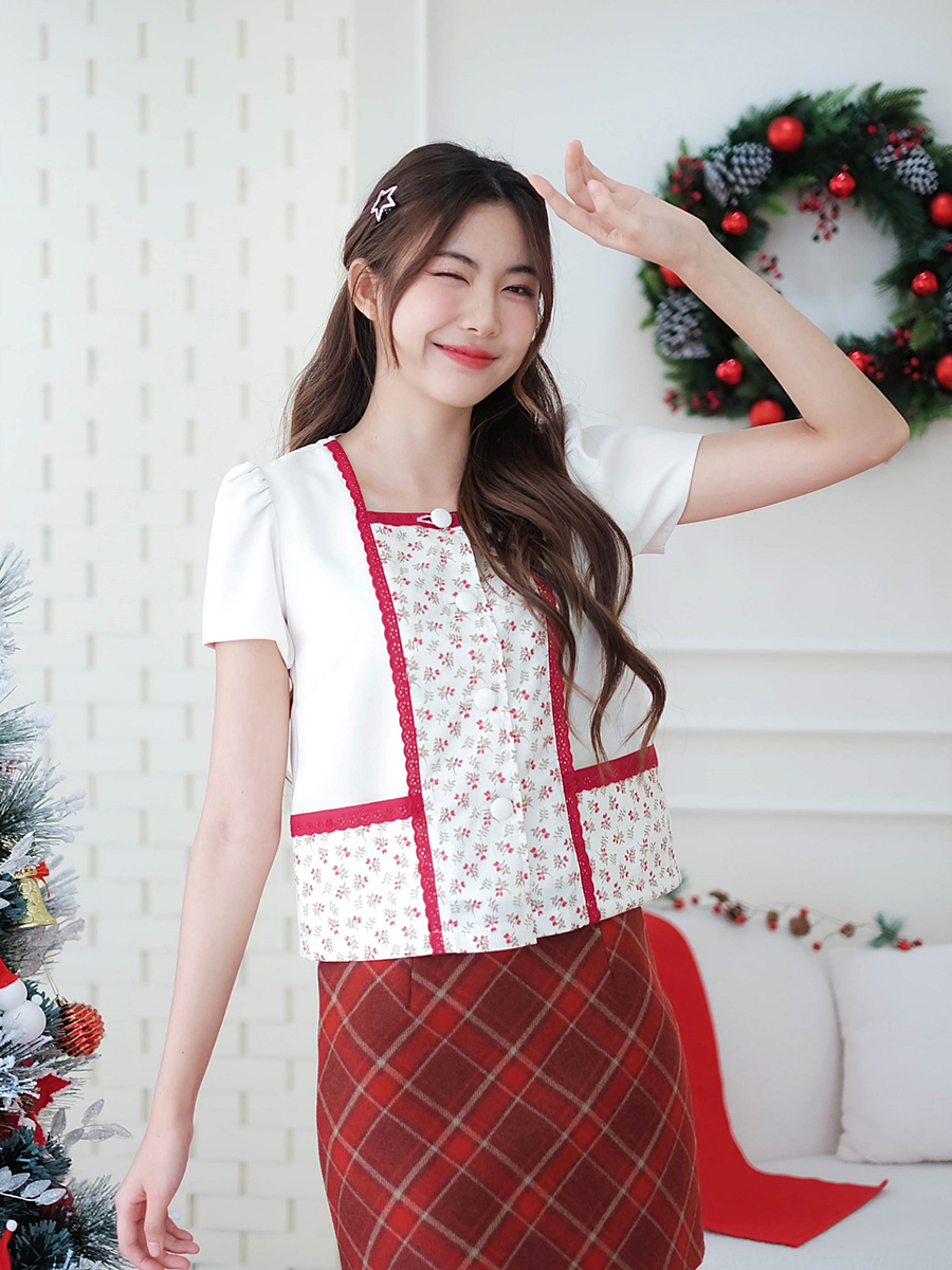 เสื้อแขนสั้นโทนสีครีมทรงคอเหลี่ยม สลับลายผ้าได้อย่างลงตัว ด้านหน้าและกระเป๋าเป็นผ้าลายดอกเล็กๆน่ารักๆ แต่งด้วยเทปลูกไม้ดีแดงเก๋ๆ มีซับใน ใส่ทำงานก็ได้ใส่เที่ยวก็น่ารัก รายการนี้แนะนำเลย งานสวยมากจริงๆไม่อยากให้พลาดเลย ใส่เที่ยว ใส่ทำงานได้ทุกโอกาส