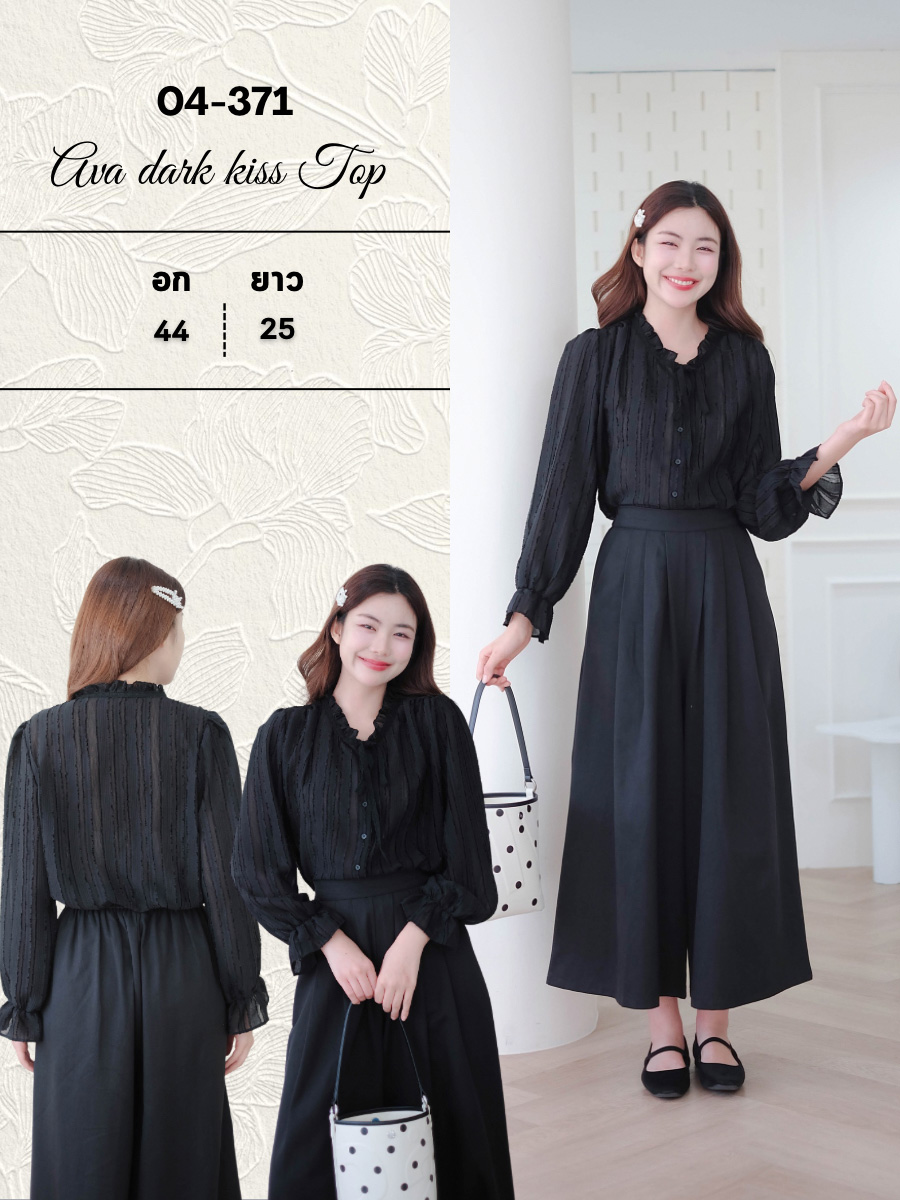 เสื้อที่มีระดับจนหยุดมองไม่ได้!กับเสื้อแขนยาวสีดำมีเท็กซ์เจอร์ลายริ้วในตัวทำให้เสื้อดูมีมิติ คอเสื้อเป็นทรงคอตั้งพร้อมระบายฟูๆและมีเชือกผูกโบว์เล็กๆเป็นผ้าลูกไม้ที่สามารถผูกหรือไม่ผูกก็ได้ดีเทลนี้ให้ลุควินเทจและอ่อนหวานมากๆ แขนเสื้อทรงพองปลายแขนระบายเป็นชั้นๆสุดหรู ทรงเสื้อปล่อยๆ ใส่สบาย แต่ยังคงความเรียบร้อย กระดุมเรียงหน้า ใส่คู่กับเกับกางเกงสแลคก็ได้ลุคทำงานที่ดูน่าสนใจหรือจะใส่กับกระโปรงก็ได้ ดีเทลคือทำให้ลุคดู High-End ห้ามพลาดชิ้นเทพตัวนี้!