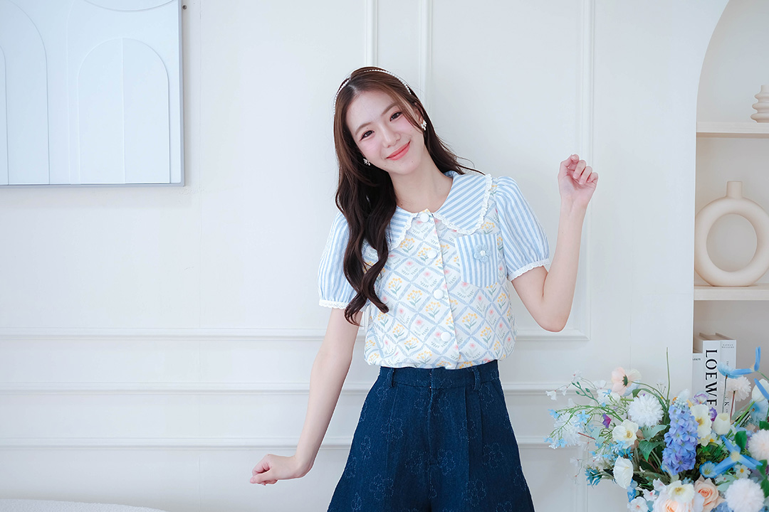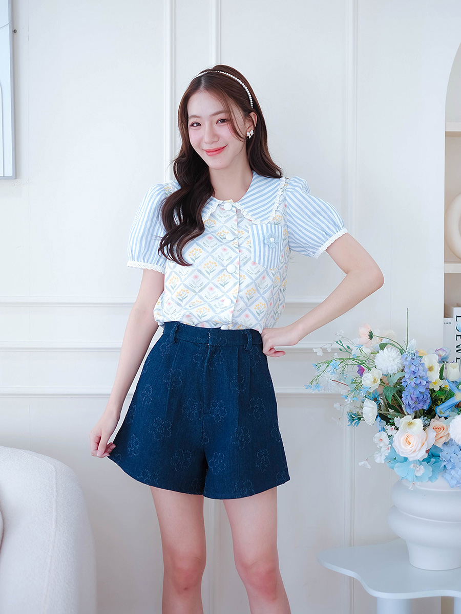 ความน่ารักมาเต็มกับเสื้อแขนสั้นทรงแขนบาร์บี้ โทนสีฟ้า ดีไซน์ตัดต่อลายผ้า 2 ชนิดผสมผสานกันอย่างลงตัว ตัวเสื้อโทนสีขาวงานปริ้นลายดอกสีสดใสในตารางสีฟ้า คอปกและปลายแขนต่อด้วยผ้าลายริ้ว ช่วงคอปกแต่งด้วยผ้าลูกไม้เล็กๆ แต่งกระเป๋าจริงติดดอกไม้ถักแบบ 3D ที่หน้าอกซ้าย เนื้อผ้าใส่แล้วไม่ร้อน มีซับในช่วงตัว แต่งกระดุมเรียงหน้า แมทกับกระโปรงหรือกางเกงก็น่ารัก ไอเท็มนี้แนะนำเลย รุ่นนี้สไตส์นี้ใส่ได้ตลอดๆนะคะ