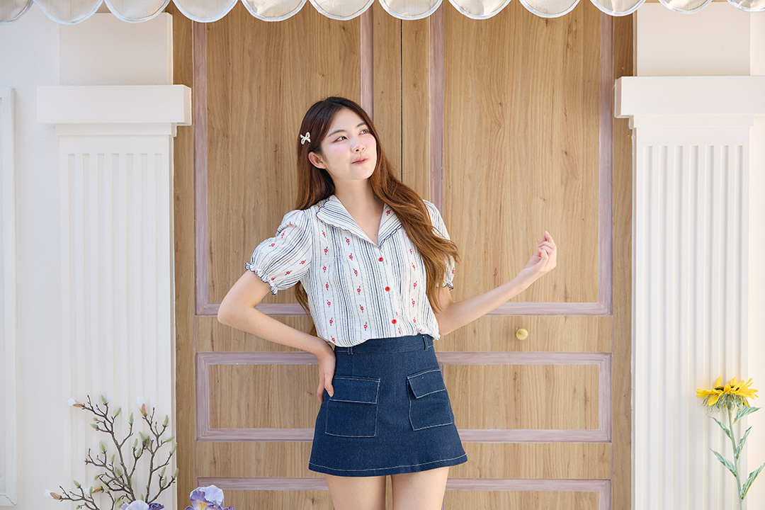 เสื้อแขนสั้นลายริ้วที่น่ารักจนใจเจ็บลุคสาวเกาหลีที่ถูกต้องที่สุด โดดเด่นด้วยผ้าสีพื้นขาวพิมพ์ลายริ้วทางตรงสีน้ำเงิน เพิ่มความคิวท์ด้วยลายดอกไม้จิ๋วสีแดงกระจายอยู่ทั่วทั้งตัว ด้านหน้าเย็บจับจีบเล็กๆ ปกเสื้อทรงกว้างขอบหยักแต่งขอบด้วยเส้นด้ายสีน้ำเงินเข้มดูมีความวินเทจนิดๆ แขนเสื้อพองๆนิดปลายแขนแต่งจั๊มระบายขอบหยัก มาพร้อมกระดุมผ่าหน้าสีแดงที่ดูตัดกันลงตัว เนื้อผ้าเบาสบายระบายอากาศดีมาก ใส่ทำงานหรือใส่เที่ยวคือได้หมด จะแมตช์แบบไหนก็ดูดี สวยจึ้งขนาดนี้ ไม่มีติดตู้ไม่ได้แล้วนะ
