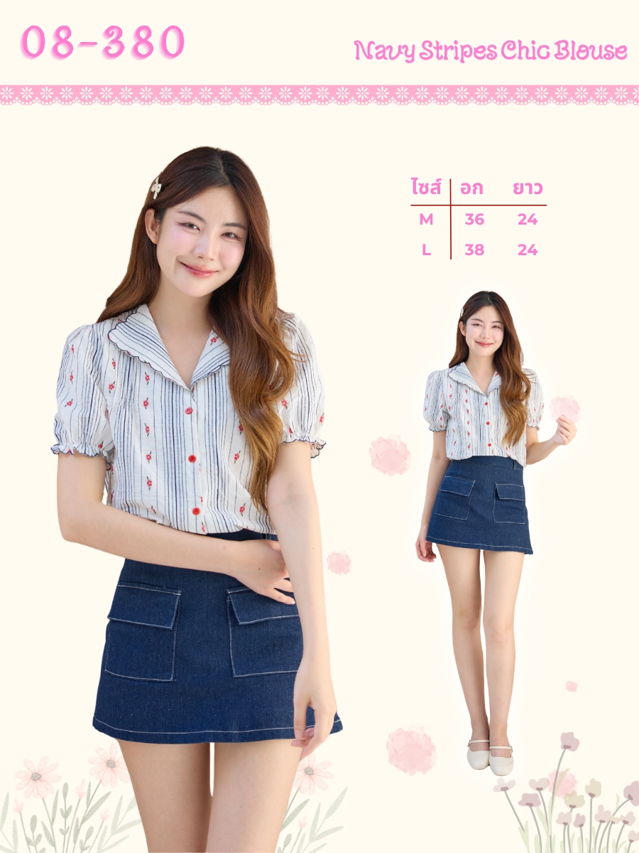 เสื้อแขนสั้นลายริ้วที่น่ารักจนใจเจ็บลุคสาวเกาหลีที่ถูกต้องที่สุด โดดเด่นด้วยผ้าสีพื้นขาวพิมพ์ลายริ้วทางตรงสีน้ำเงิน เพิ่มความคิวท์ด้วยลายดอกไม้จิ๋วสีแดงกระจายอยู่ทั่วทั้งตัว ด้านหน้าเย็บจับจีบเล็กๆ ปกเสื้อทรงกว้างขอบหยักแต่งขอบด้วยเส้นด้ายสีน้ำเงินเข้มดูมีความวินเทจนิดๆ แขนเสื้อพองๆนิดปลายแขนแต่งจั๊มระบายขอบหยัก มาพร้อมกระดุมผ่าหน้าสีแดงที่ดูตัดกันลงตัว เนื้อผ้าเบาสบายระบายอากาศดีมาก ใส่ทำงานหรือใส่เที่ยวคือได้หมด จะแมตช์แบบไหนก็ดูดี สวยจึ้งขนาดนี้ ไม่มีติดตู้ไม่ได้แล้วนะ